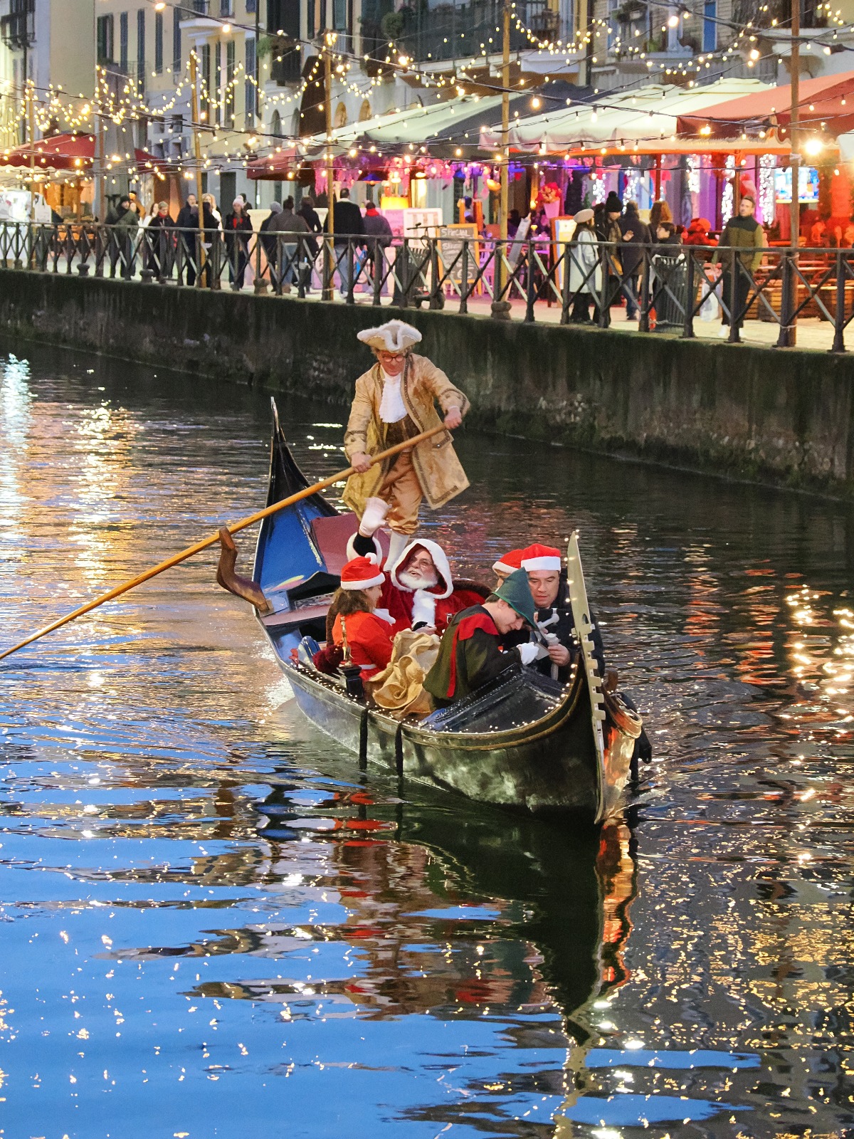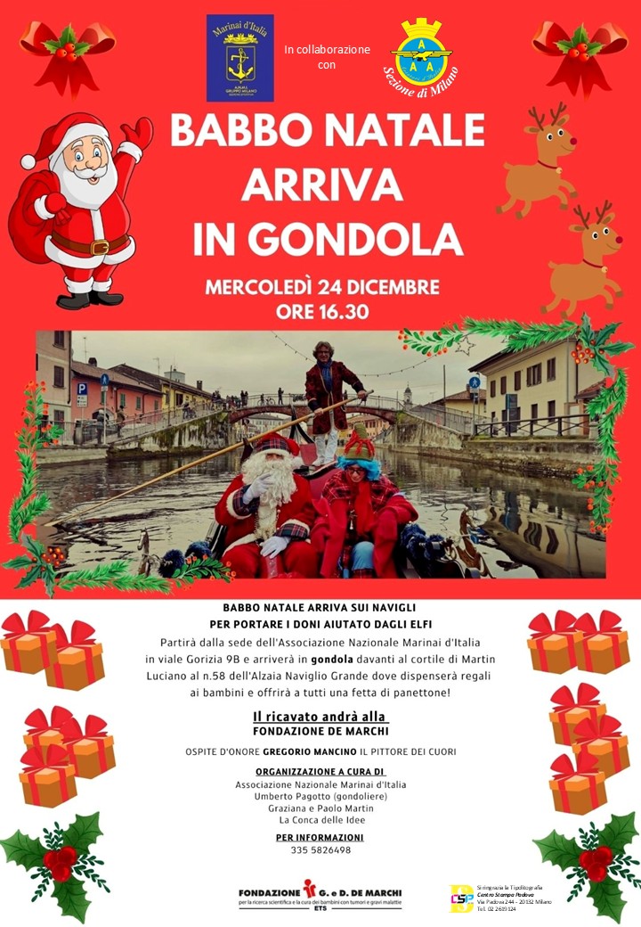 BABBO NATALE APPRODA LUNGO IL NAVIGLIO GRANDE sulla Gondola di Umberto Pagotto, PROPRIO DI FRONTE AL NOSTRO CIVICO N.58!